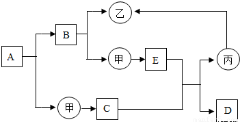 精英家教網(wǎng)如圖是初中化學(xué)中常見物質(zhì)間的轉(zhuǎn)化關(guān)系,其中甲、乙、丙為單質(zhì);A、B、C、D、E為化合物,且A與B的組成元素相同,D與E的組成元素也相同.已知C、丙均為黑色粉末,C和E在高溫條件下反應(yīng)可生成丙和D,其余反應(yīng)條件、部分反應(yīng)物和生成物均已略去.試推斷: