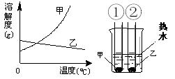 甲、乙兩種固體的溶解度曲線如右下圖。將①②兩試管中的甲、乙飽和溶液(均有少量未溶解的固體)放進(jìn)盛有熱水的燒杯里。升高溫度后,下列有關(guān)說(shuō)法正確的是( )![]()