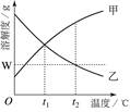 | B.溫度降低到t1℃時(shí),得到甲、乙的飽和溶液 |
