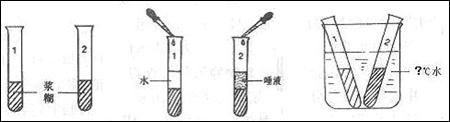 探究唾液對(duì)淀粉的消化作用過(guò)程如下: 向1號(hào)、2號(hào)試管中各加入2毫升漿糊;再向1號(hào)試管中加入2毫升清水,2號(hào)試管中加入2毫升唾液。將2支試管充分振蕩后,放入盛有37℃溫水的燒杯中10分鐘取出,待冷卻后各加入2滴碘液(淀粉遇到碘液變藍(lán)),觀察實(shí)驗(yàn)現(xiàn)象;卮鹩嘘P(guān)問(wèn)題:(本小題3分)