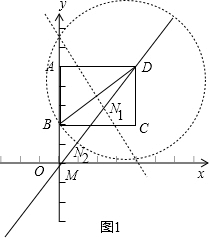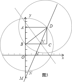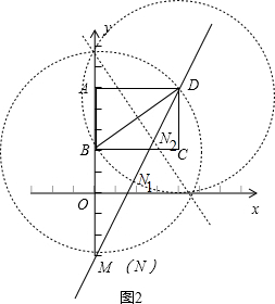 分別以B、D為圓心BD為半徑畫圓,與DM交于點(diǎn)M和N1,和BD的垂直平分線交DM于點(diǎn)N2,故此時(shí)滿足條件的N點(diǎn)有3個(gè),