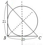 如圖所示,△ABC中,∠B=90°,AB=21,BC=20.若有一半徑為10的圓分別與AB、BC相切,則下列何種方法可找到此圓的圓心( )