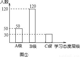 學(xué)生的學(xué)業(yè)負(fù)擔(dān)過重會嚴(yán)重影響學(xué)生對待學(xué)習(xí)的態(tài)度.為此我市教育部門對部分學(xué)校的八年級學(xué)生對待學(xué)習(xí)的態(tài)度進(jìn)行了一次抽樣調(diào)查(把學(xué)習(xí)態(tài)度分為三個層級,A級:對學(xué)習(xí)很感興趣;B級:對學(xué)習(xí)較感興趣;C級:對學(xué)習(xí)不感興趣),并將調(diào)查結(jié)果繪制成圖①和圖②的統(tǒng)計圖(不完整).請根據(jù)圖中提供的信息,解答下列問題: