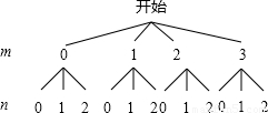 ∴(m,n)所有取值是(0,0),(0,1),(0,2),(1,0),(1,1),(1,2),(2,0),(2,1),(2,2),(3,0),(3,1),(3,2).