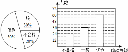 某中學(xué)對(duì)全校學(xué)生進(jìn)行文明禮儀知識(shí)測(cè)試,為了解測(cè)試結(jié)果,隨機(jī)抽取部分學(xué)生的成績(jī)進(jìn)行分析,將成績(jī)分為三個(gè)等級(jí):不合格、一般、優(yōu)秀,并繪制成如下兩幅統(tǒng)計(jì)圖(不完整).請(qǐng)你根據(jù)圖中所給的信息解答下列問題: