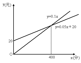 一家電信公司給顧客提供兩種上網(wǎng)收費方式:方式A以每分0.1元的價格上網(wǎng)時間計費;方式B除收月基費20元外,再以每分0.05元的價格按上網(wǎng)時間計費,如何選擇收費方式能使上網(wǎng)者更合算?(借助圖象求解)