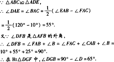 如圖所示,已知△ABC≌△ADE.且∠CAD=10°,∠B=∠D=25°,∠EAB=120°.求∠DFB和∠DGB的度數(shù).