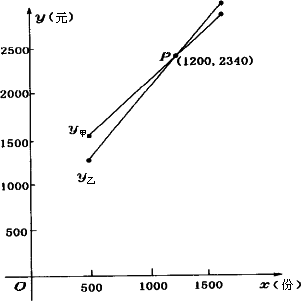 (1)y甲=1.2x+900(元),x≥500(份),且x是整數(shù). y乙=1.5x+540(元)x≥500(份),且x是整數(shù). (2)答:當(dāng)500≤x<1200份時(shí),選擇乙廠比較合算; 當(dāng)x=1200份時(shí),兩個(gè)廠的收費(fèi)相同; 當(dāng)x>1200份時(shí),選擇甲廠比較合算; 所以要印2000份錄取通知書,應(yīng)選擇甲廠,費(fèi)用是3300元. 解法一:若y甲>y乙,即1.2x+900>1.5x+540.∴x<1200 若y甲=y(tǒng)乙,即1.2x+900=1.5x+540,∴x=1200. 若y甲<y乙,即1.2x+900<1.5x+540,∴x>1200. 以上逆推仍成立. 解法二:作一次函數(shù)y甲=1.2x+900和y2=1.5x+540的圖象,如圖所示: 當(dāng)500≤x<1200份時(shí),選擇乙廠比較合算; 當(dāng)x=1200份時(shí),兩個(gè)廠的收費(fèi)相同; 當(dāng)x>1200份時(shí),選甲廠比較合算. 所以要印2000份通知書,應(yīng)選擇甲廠,當(dāng)x=2000時(shí),y甲=3300.費(fèi)用是3300元.