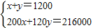 2010年上海世博會入園門票有11種之多,其中“指定日普通票”價格為200元一張,“指定日優(yōu)惠票”價格為120元一張,某門票銷售點在5月1日開幕式這一天共售出這兩種門票1200張,收入216000元,該銷售點這天分別售出這兩種門票多少張?