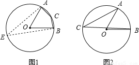解答:解:(1)如圖1,C點(diǎn)在劣弧AB上,在優(yōu)弧AB上取點(diǎn)E,連接AE、BE,