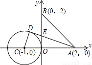 如圖,已知A,B兩點(diǎn)的坐標(biāo)分別為(2,0),(0,2),⊙C的圓心坐標(biāo)為(-1,0),半徑為1.若D是⊙C上的一個(gè)動(dòng)點(diǎn),線段DA與y軸交于點(diǎn)E,則△ABE面積的最小值是