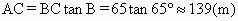 一座埃及金字塔被發(fā)現(xiàn)時,頂部已經(jīng)蕩然無存,但底部未曾受損,是一個邊長為130m的正方形,且每一個側(cè)面與地面成65°角,這個金字塔原來有多高(結(jié)果取整數(shù))?