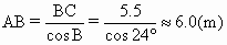 如圖,在山坡上種樹,要求株距(相鄰兩樹間的水平距離)是5.5m.測得斜坡的傾斜角是24°,求斜坡上相鄰兩樹間的坡面距離(結(jié)果保留小數(shù)點后一位).