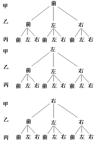 由圖知,一共有27種結(jié)果 ①三輛車(chē)全部繼續(xù)前行的情況有1種;所以P(三輛車(chē)全部繼續(xù)前行)= ②兩輛車(chē)向右轉(zhuǎn),一輛車(chē)向左轉(zhuǎn)的情況有3種;所以P(兩輛車(chē)向右轉(zhuǎn),一輛車(chē)向左轉(zhuǎn))= ③至少有兩輛車(chē)向左轉(zhuǎn)的情況有7種;所以P(至少有兩輛車(chē)向左轉(zhuǎn))= |