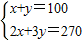 食品安全是老百姓關注的話題,在食品中添加過量的添加劑對人體有害,但適量的添加劑對人體無害且有利于食品的儲存和運輸.某飲料加工廠生產(chǎn)的A、B兩種飲料均需加入同種添加劑,A飲料每瓶需加該添加劑2克,B飲料每瓶需加該添加劑3克,已知270克該添加劑恰好生產(chǎn)了A、B兩種飲料共100瓶,問A、B兩種飲料各生產(chǎn)了多少瓶?