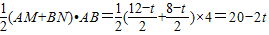 (2)同(1),當(dāng)0≤t≤4時(shí),如圖1所示,則QB=t,BR=8-t所以BM=即S=-t2+4t;當(dāng)4<t≤8時(shí),QB=t,BR=8-t,QA=t-4,AR=AB+BR=4+(8-t)=12-t,所以AM=,BN=,即S=AM•AR=-t2+4t(8<t≤12);
