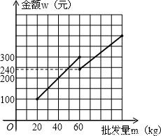 (2)寫出批發(fā)該種水果的資金金額w(元)與批發(fā)量m(kg)之間的函數(shù)關(guān)系式;在下圖的坐標(biāo)系中畫出該函數(shù)圖象;指出金額在什么范圍內(nèi),以同樣的資金可以批發(fā)到較多數(shù)量的該種水果.