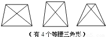 (3)等腰梯形的性質,結合等腰三角形的判定,上底=腰,底角=72°的等腰梯形有8個等腰三角形.