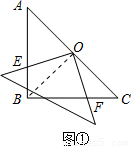 在Rt△ABC中,AB=BC=5,∠B=90°,將一塊等腰直角三角板的直角頂點(diǎn)放在斜邊AC的中點(diǎn)O處,將三角板繞點(diǎn)O旋轉(zhuǎn),三角板的兩直角邊分別交AB,BC或其延長線于E,F(xiàn)兩點(diǎn),如圖(1)與(2)是旋轉(zhuǎn)三角板所得圖形的兩種情況.