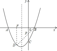(2)根據(jù)拋物線的解析式即可得到其對稱軸及B點的坐標(biāo),由于A、B關(guān)于拋物線對稱軸對稱,連接BD,BD與拋物線對稱軸的交點即為所求的P點,那么PA+PD的最小值即為BD的長,根據(jù)B、D的坐標(biāo),即可用勾股定理(或坐標(biāo)系兩點間的距離公式)求出BD的長,也就求得了PA+PD的最小值.