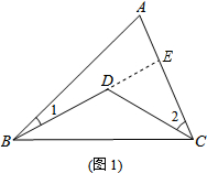 分析:(1)延長BD交AC于點E,由三角形外角的性質(zhì)可知∠BDC=∠BEC+∠2,∠BEC=∠1+∠A,故可得出∠BDC=∠1+∠2+∠A,由此即可得出結(jié)論;