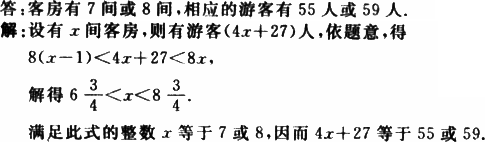 一群游客到賓館住宿,如果每間住4人,則余27人;如果每間住8人,則最后一間不空也不滿.那么共有多少名游客?多少間客房?