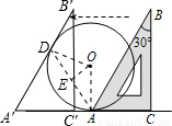 【答案】分析:根據(jù)題意畫出平移后的圖形,如圖所示,設(shè)平移后的△A′B′C′與圓O相切于點D,連接OD,OA,AD,過O作OE⊥AD,根據(jù)垂徑定理得到E為AD的中點,由平移前AC與圓O相切,切點為A點,根據(jù)切線的性質(zhì)得到OA與AC垂直,可得∠OAA′為直角,由A′D與A′A為圓O的兩條切線,根據(jù)切線長定理得到A′D=A′A,再根據(jù)∠B′A′C′=60°,根據(jù)有一個角為60°的等腰三角形為等邊三角形可得出三角形A′AD為等邊三角形,平移的距離AA′=AD,且∠DAA′=60°,由∠OAA′-∠DAA′求出∠OAE為30°,在直角三角形AOE中,由銳角三角函數(shù)定義表示出cos30°=,把OA及cos30°的值代入,求出AE的長,由AD=2AE可求出AD的長,即為平移的距離.