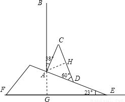 如圖所示,山坡上有一棵與水平面垂直的大樹(shù),一場(chǎng)臺(tái)風(fēng)過(guò)后,大樹(shù)被刮傾斜后折斷倒在山坡上,樹(shù)的頂部恰好接觸到坡面.已知山坡的坡角∠AEF=23°,量得樹(shù)干傾斜角∠BAC=38°,大樹(shù)被折斷部分和坡面所成的角∠ADC=60°,AD=4m![]()