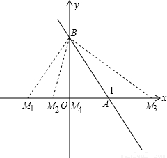 分析:分別令一次函數(shù)y=-x+1中x=0和y=0求出相應的y與x的值,得到A和B的坐標,進而得到OA與OB的長,利用勾股定理求出AB的長,根據(jù)題意可分4種情況考慮,當BM=BA時,由BO垂直于MA,根據(jù)三線合一得到O為MA的中點,由OA得長得到OM的長,根據(jù)M為x軸負半軸的點寫出此時M的坐標即可;當AB=AM時,由AB的長,得到AM的長,進而由AM-OA得到OM的長,寫出M的坐標即可;當MA=MB時,此時M與原點O重合,寫出M的坐標;當AB=AM時,由AB的長得到AM的長,由OA+AM得到OM的長,寫出M的坐標即可.