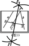 ②在圖3的畫板內(nèi),作出“直線a、b所成的跑到畫板外面去的角”的平分線(在畫板內(nèi)的部分),只要求作出圖形,并保留作圖痕跡.