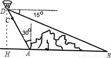 如圖,在小山的西側(cè)A處有一熱氣球,以30米/分鐘的速度沿著與垂直方向所成夾角為30°的方向升空,40分鐘后到達C處,這時熱氣球上的人發(fā)現(xiàn),在A處的正東方向有一處著火點B,十分鐘后,在D處測得著火點B的俯角為15°,求熱氣球升空點A與著火點B的距離。(結(jié)果保留根號,參考數(shù)據(jù):