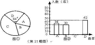 為慶祝建黨90周年,某校團委計劃在“七·一”前夕舉行“唱響紅歌”班級歌詠比賽,要確定一首喜歡人數(shù)最多的歌曲為每班必唱歌曲。為此提供代號為A、B、C、D四首備選曲目讓學生選擇,經(jīng)過抽樣調(diào)查,并將采集的數(shù)據(jù)繪制如下兩幅不完整的統(tǒng)計圖。請根據(jù)圖①,圖②所提供的信息,解答下列問題:
