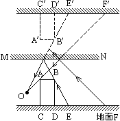 如圖所示,水平地面上有一障礙物ABCD,較大平面鏡MN在某一高度水平放置,試用作圖法求出眼睛位于O點時,從平面鏡中所能看到障礙物后方地面的范圍,如果想在原處看到更大范圍的地面,水平放置的鏡子高度應(yīng)該怎樣改變?