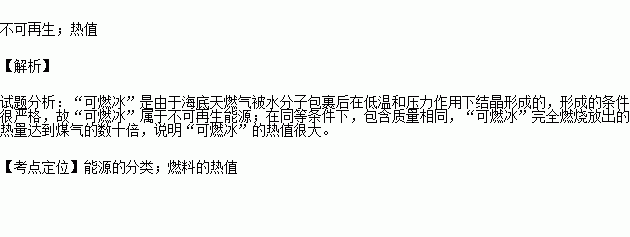 2017年3月10日,我國(guó)在南海海底開采出天然氣水合物,俗稱“可燃冰”,它是由天然氣和水在高壓低溫的條件下形成的類冰狀結(jié)晶物質(zhì),可燃冰能量密度大,1m3的可燃冰釋放出約0.8m3的水和164m3的天然氣,可燃冰是 (選填,可再生、不可再生)能源,它的“能量密度大”是指它的 選(填密度、內(nèi)能、熱量、熱值)大.