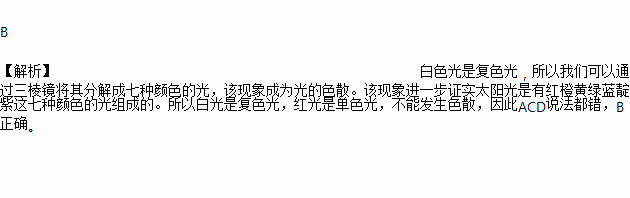 A. 白光是單色光 B. 白光是復(fù)合光 C. 紅光是復(fù)合光 D. 紅光能發(fā)生色散