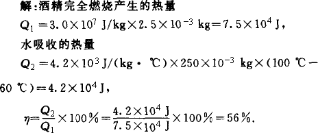 在“觀察水的沸騰”實(shí)驗(yàn)中,用酒精燈將杯中250 g,60℃的熱水加熱到沸騰,共用去2.5 g酒精.問:酒精完全燃燒放出的熱量中,有百分之幾被水吸收?(已知實(shí)驗(yàn)室的氣壓為1標(biāo)準(zhǔn)大氣壓,酒精的熱值為3.0×107 J/kg)