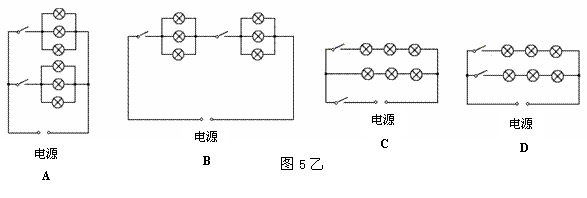 圖5(甲)所示為家庭中的裝飾吊燈,共有六盞燈,由兩個開關(guān)控制,每個開關(guān)控制三盞燈,每盞燈正常工作時的電壓都是220V。則圖5(乙)所示電路中,與之對應(yīng)的是( )
