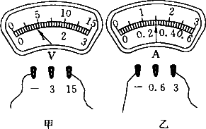 在用電壓表測電壓、電流表測電流的實驗中,當(dāng)U=4.5 V,I=1.5 A,在圖甲、乙中標(biāo)出指針的位置和使用的接線柱.