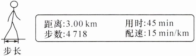 由圖可知,步行距離s=3.00km,用時t=45min=0.75h,步數(shù)n=4718,配速15min/km。