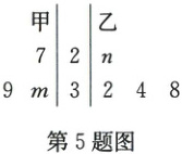 5. 已知甲、乙兩組數(shù)據(jù)如莖葉圖所示,其中 $ m $、$ n \in \mathbf{N} $.若這兩組數(shù)據(jù)的中位數(shù)相等,平均數(shù)也相等,則 $ \frac { m } { n } = $