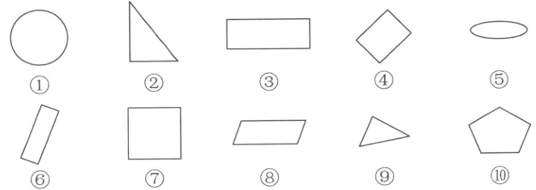長方形是四個角為直角、對邊相等的四邊形,③⑥符合;正方形是四個角為直角、四邊相等的四邊形,④⑦符合;圓形是由曲線圍成的封閉圖形,①符合;三角形是由三條線段圍成的封閉圖形,②⑨符合;平行四邊形是對邊平行且相等的四邊形,⑧符合。