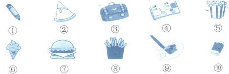 文具類:①是鉛筆,③是書包,④是筆記本,⑨是調(diào)色板和畫筆,⑩是橡皮,所以文具類序號為①③④⑨⑩。