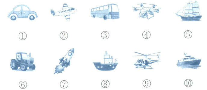 先觀察每個物品的特征,判斷其運(yùn)動方式。天上“飛”的是能在空中飛行的,有飛機(jī)(②)、無人機(jī)(④)、火箭(⑦)、直升機(jī)(⑨);水里“游”的是在水中行駛的,有帆船(⑤)、輪船(⑧)、游艇(⑩);地上“走”的是在地面行駛的,有汽車(①)、公交車(③)、拖拉機(jī)(⑥)。