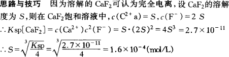 答案:CaF2在純水中的溶解度是1.6×10-4 mol/L. 規(guī)律總結(jié):對(duì)于同類型的難溶電解質(zhì),在一定溫度下,Ksp越大,溶解度越大.對(duì)于不同類型的電解質(zhì),不能從溶度積的大小立即判斷出物質(zhì)的溶解度,必須利用前面的計(jì)算方法進(jìn)行換算,才能得出準(zhǔn)確的結(jié)論. |