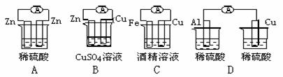 有A、B、C、D四種金屬。將A與B用導(dǎo)線連接起來(lái),浸入電解質(zhì)溶液中,B為正極。將A、D分別投入等濃度鹽酸中,D比A反應(yīng)劇烈。將銅浸入B的鹽溶液里,無(wú)明顯變化。如果把銅浸入C的鹽溶液里,有金屬C析出。據(jù)此判斷它們的活動(dòng)性由強(qiáng)到弱的順序是 ( )