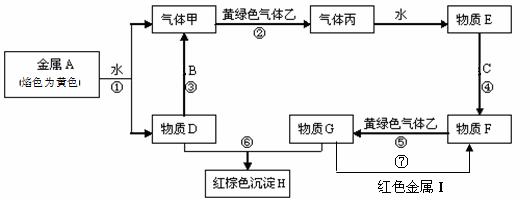 現(xiàn)有金屬單質(zhì)A、B、C、I和氣體甲、乙、丙及物質(zhì)D、E、F、G、H。其中B是地殼中含量最多的金屬。它們之間能發(fā)生如下反應(yīng)(圖中有些反應(yīng)的產(chǎn)物和反應(yīng)的條件沒有全部標(biāo)出)。