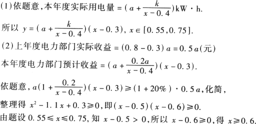 (2)設(shè)k=0.2a,當電價最低定為多少時仍可保證電力部門的收益比上年至少增長20%?(注:收益=實際用電量×(實際電價-成本價))