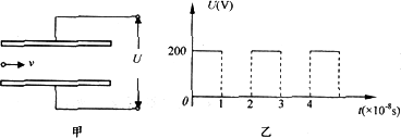 兩平行金屬板長(zhǎng)L=0.1 m,板間距離d=1×10-2 m.從兩板左端正中間有帶電粒子持續(xù)飛入,如圖甲所示.粒子的電量q=10-10 c,質(zhì)量m=10-20 kg,初速度方向平行于極板,大小為v=107 m/s.在兩極板上加一按如圖乙所示規(guī)律變化的電壓,不計(jì)帶電粒子之間的相互作用和重力作用,求: