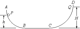 (10分)滑板運(yùn)動(dòng)是一項(xiàng)驚險(xiǎn)刺激的運(yùn)動(dòng),深受青少年的喜愛.如圖是滑板運(yùn)動(dòng)的軌道,AB和CD是一段圓弧形軌道,BC是一段長(zhǎng)7m的水平軌道.一運(yùn)動(dòng)員從AB軌道上P點(diǎn)以6m/s的速度下滑,經(jīng)BC軌道后沖上CD軌道,到Q點(diǎn)時(shí)速度減為零.已知運(yùn)動(dòng)員的質(zhì)量50kg,h=1.4m,H=1.8m,不計(jì)圓弧軌道上的摩擦.(g=10m/s2)求: