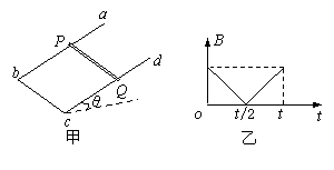 如圖甲中abcd為導(dǎo)體做成的框架,其平面與水平面成θ角。質(zhì)量為m的導(dǎo)體棒PQ與ab、cd接觸良好,回路的電阻為R,整個裝置放于垂直框架平面的變化的磁場中,磁感強度B隨時間變化規(guī)律如圖乙,PQ始終保持靜止。在0~t時間內(nèi),PQ受到的摩擦力f的大小變化情況是